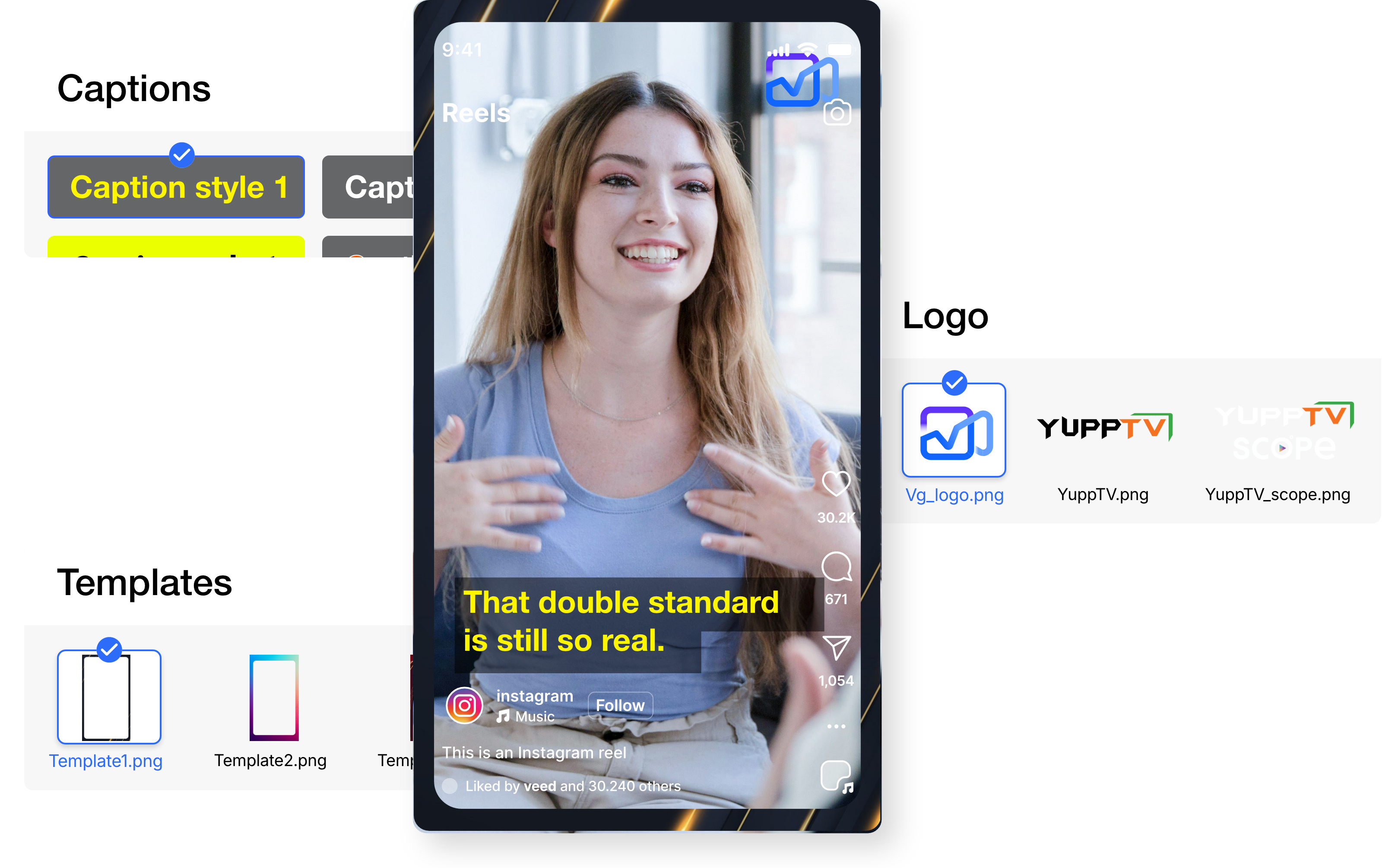 Immediately enhance trimmed clips with captions, branding templates, overlays, and visual elements.